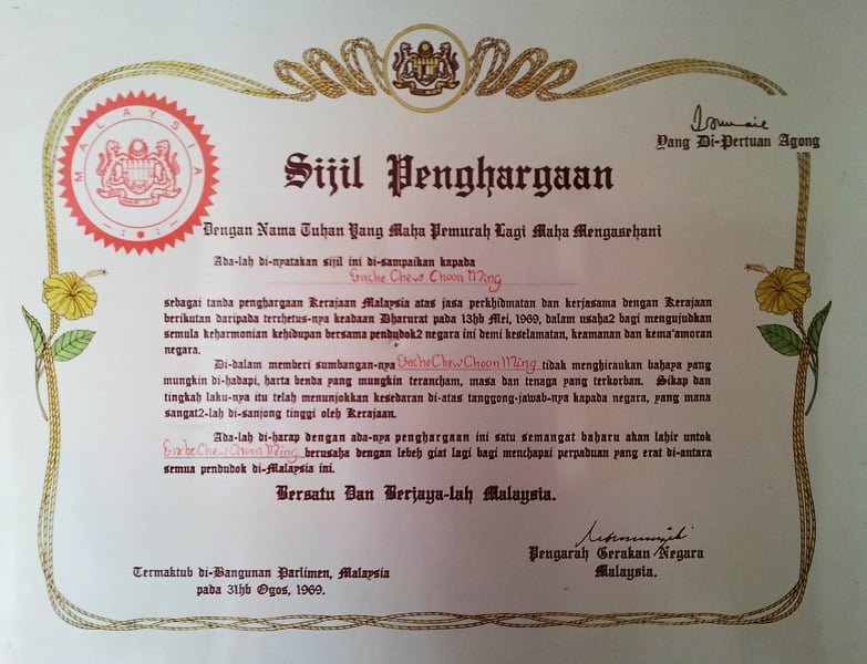- Xian Sheng chuckled as he said that if he were a bad person, he would not have been awarded the ‘Certificate of Appreciation’ from DYMM Yang Di-Pertuan Agong on 31 August 1969 for his bravery during the race riots of 13 May 1969. However, Xian Sheng did not use this certificate for personal gain.